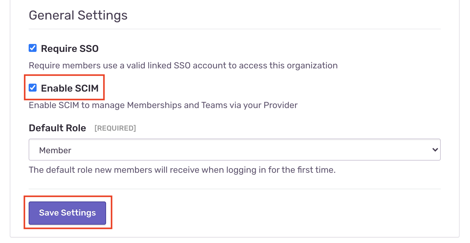 2. Under General Settings select "Enable SCIM", then "Save Settings" Sentry Enable SCIM InstructionSentry will display "SCIM Information" that contains your Auth Token and SCIM Base URL. SCIM Credentials Fields