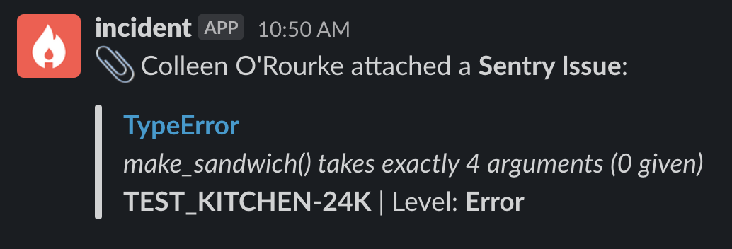To attach a Sentry issue to an incident in Slack, share a link to the Sentry issue and click "Yes, attach it" when prompted: