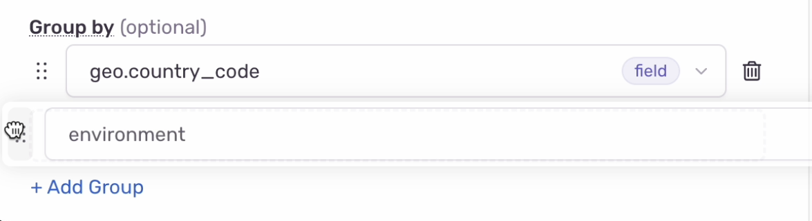 The option to group results is only available for time-series visualizations. You can group your time series results by different fields or tags such as project, environment, or transaction. You can select up to 20 fields to group your data.